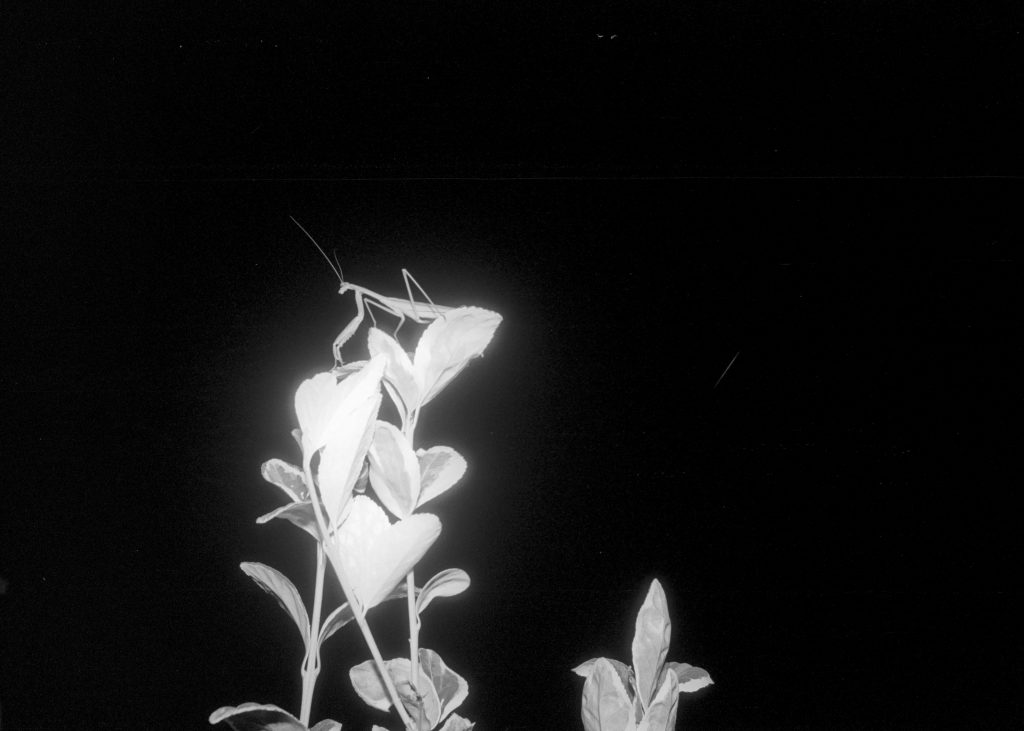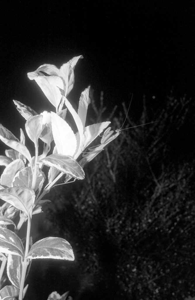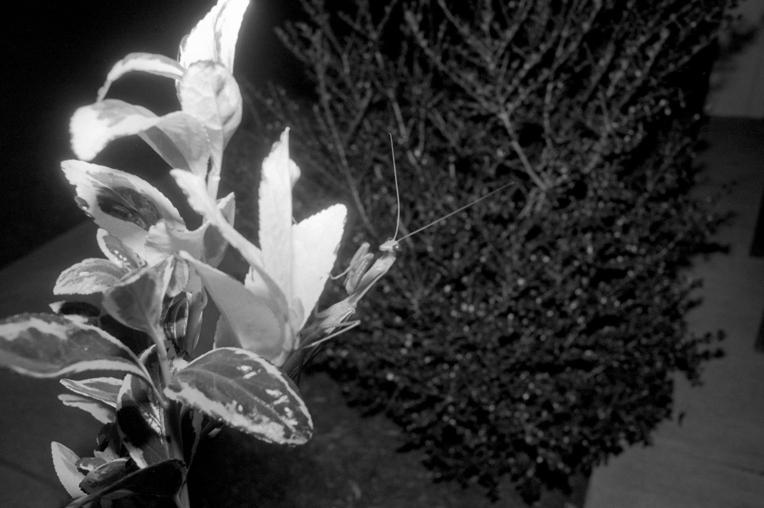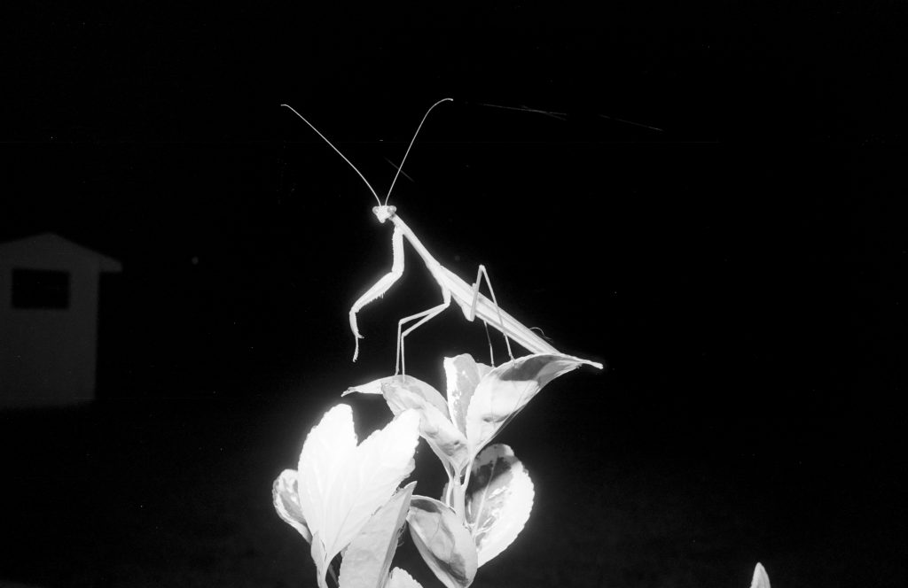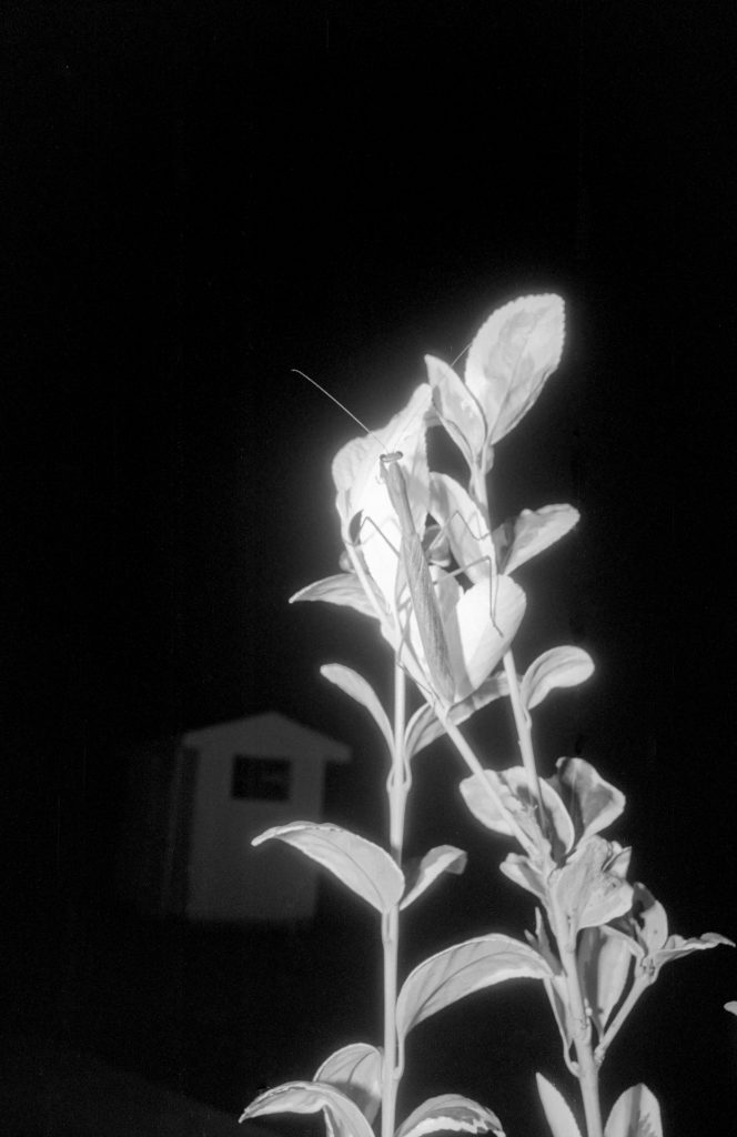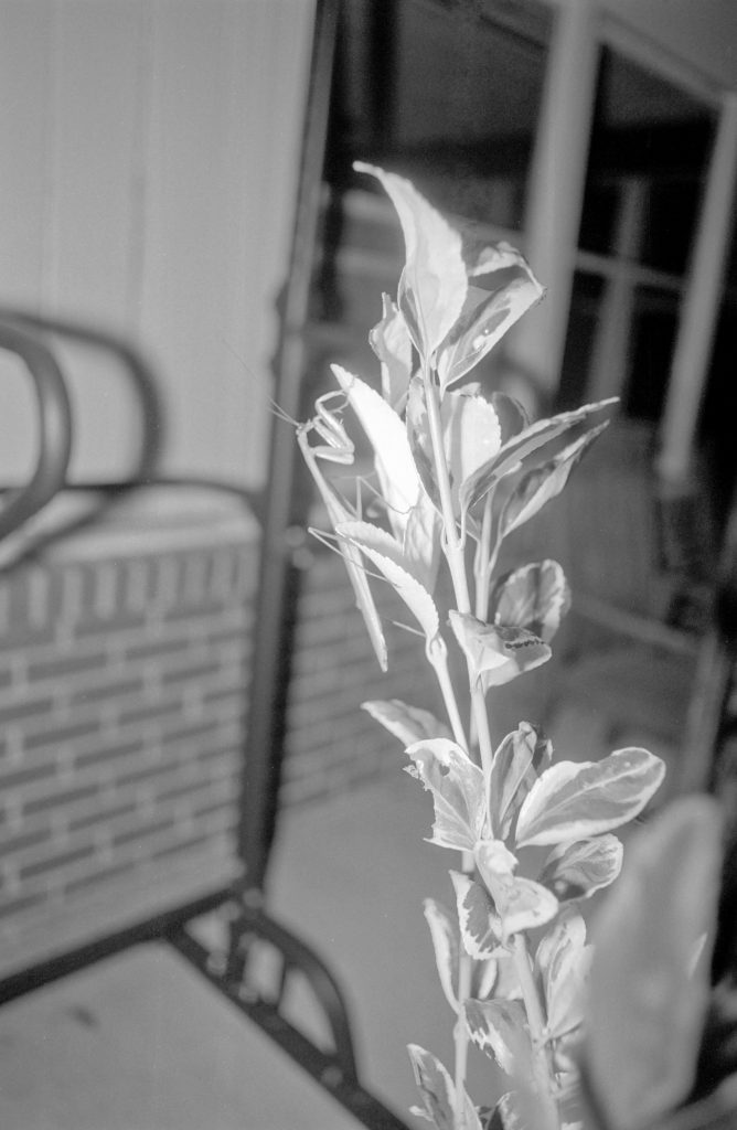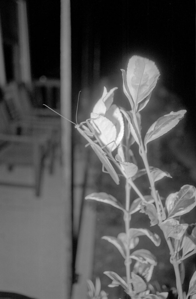 I managed to catch some neat pictures of a praying mantis. It was a night, and I had just loaded a roll of Kentmere 100 in my camera. Needless to say, I needed my flash.